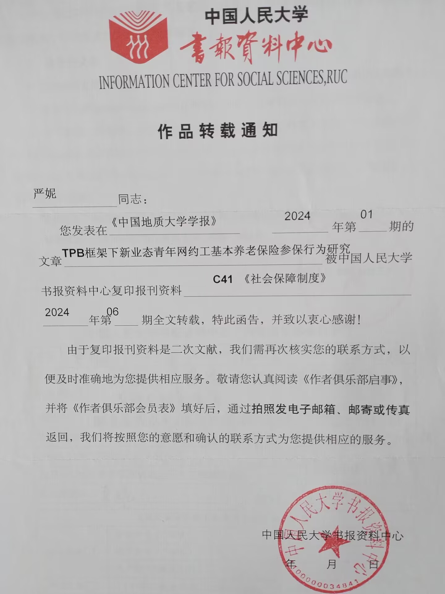 9999js金沙老品牌严妮、任立等老师合作完成的学术论文《TPB 框架下新业态青年网约工基本养老保险参保行为研究——基于问卷调查的微观实证》,于2024年6月被中国人民大学书报资料中心《社会保障制度》全文转载。人大复印资料是由中国人民大学主办、国内人文社会科学领域极具权威性的“二次文献转载体系”,其核心功能是筛选、浓缩、传播各学科领域的高质量研究成果,是人文社科领域对“高质量研究”的官方认可。该论文原载于《中国地质大学学报(社会科学版)》2024年第1期,此次转载充分体现了研究成果在社会保障领域的学术价值与实践参考意义。